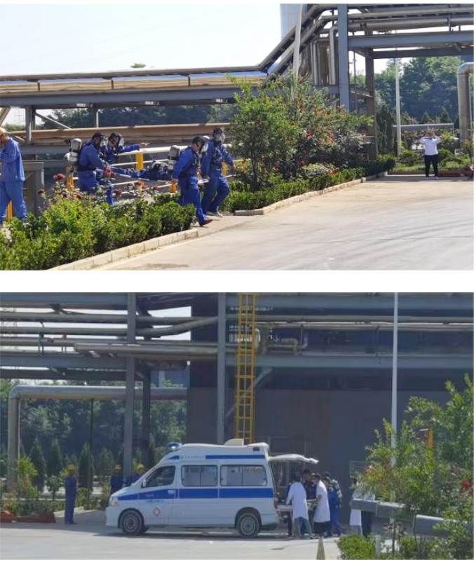 本次演练以“山西鑫途化工有限公司发现三级再热器底部管道阀门法兰泄漏”为模拟背景,应急预案启动后,导演组安排鑫途化工有限公司2名人员佩戴防毒面具,带工具进入现场实施堵漏,现场处置过程中,1名员工面罩脱落,窒息中毒,紧急通知120急救中心到达现场,医生、护士给中毒人员做了初步处理后,迅速将中毒人员抬上救护车,转送医院。